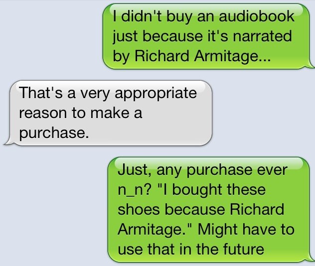 The Lords of the North was much more engrossing as performed in the audiobook. I’m a big fan of Richard Armitage after consuming pretty much everything he’s ever been in the weeks before The Hobbit came out, and my expectations were not disappointed. The performance here is spectacular. Because the book is told in first person by a man, the story was much more effective being read by a man. Though it gets a little weird when that man also has to read the female voices – which, in one scene, includes a lot of screaming – but only because Richard Armitage’s voice is so deep. In truth, he managed lot of voices, some of which were variations of his natural voice, some of which were, as mentioned above, women screaming.Because I’m a huge nerd, I kept a list of voices I heard:Guy of Gisborne, Thorin Oakenshield, high born lady, low born woman, little girl (who sounded like Georgie Henly as Lucy Pevensie in The Lion, the Witch, and the Wardrobe), little boy, feeble old man, prissy priest, a man who sounded like Lane Pryce, King Alfred sounded like Edward Norton as King Baldwin in Kingdom of Heaven, Steapa sounded like Hagrid, Ragnar sounded like Joe Armstrong as Hotspur in The Hollow Crown: Henry IV, Part I, Finan sounded like Branson from Downton Abbey, and a collection of Danish accents!Using several of those while having a conversation with yourself is a talent, no?All in all, the story is enough to make me pick up the next two books in the series, to follow the adventures of Uhtred and his far-flung allies. Though I’ll miss the Richard Armitage narration. If he could just stop aging this very moment and wait about ten years, I would be more than happy to demand that he be cast in the HBO adaptation of my novel.